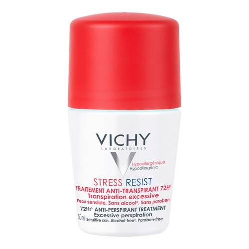 VICHY STRESS RESIST TRAITEMENT ANTI-TRASPIRANT 72H TRATTAMENTO INTENSIVO ANTI-TRASPIRANTE Prodotto testato su pelli sensibili. Innovazione anti-traspirante: regola la traspirazione eccessiva per 72 ore anche in condizioni di stress, lasciando respirare la pelle. Senza etanolo. Texture fresca, asciugatura rapida, non appiccica, anti-arrossamenti connessi alla depilazione. Efficacia testata sotto controllo dermatologico. Ipoallergenico. Senza alcool. Modalità d'uso Applicare il trattamento quotidianamente. Può essere utilizzato anche su mani e piedi. Formato Roll-on da 50 ml Cod.M5070700